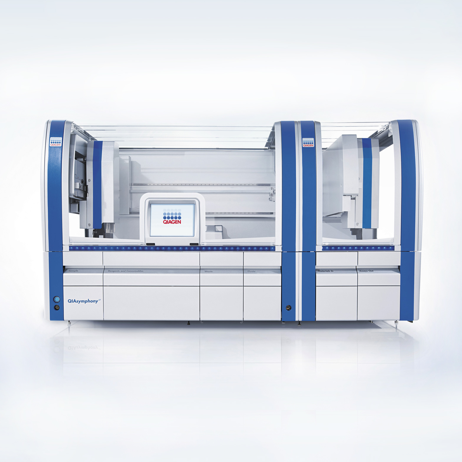 Equipo para una automatización totalmente integrada de flujos de trabajo completos, desde la preparación de la muestra hasta la configuración del ensayo Sistema modular. Purificación de ADN y ARN a partir de una amplia gama de muestras. Transferencia automática de eluatos a QIAsymphony AS para la configuración del ensayo Carga continua de muestras, con lectura de códigos de barras para seguimiento de muestras Importación de listas de muestra y exportación de hojas de muestra.